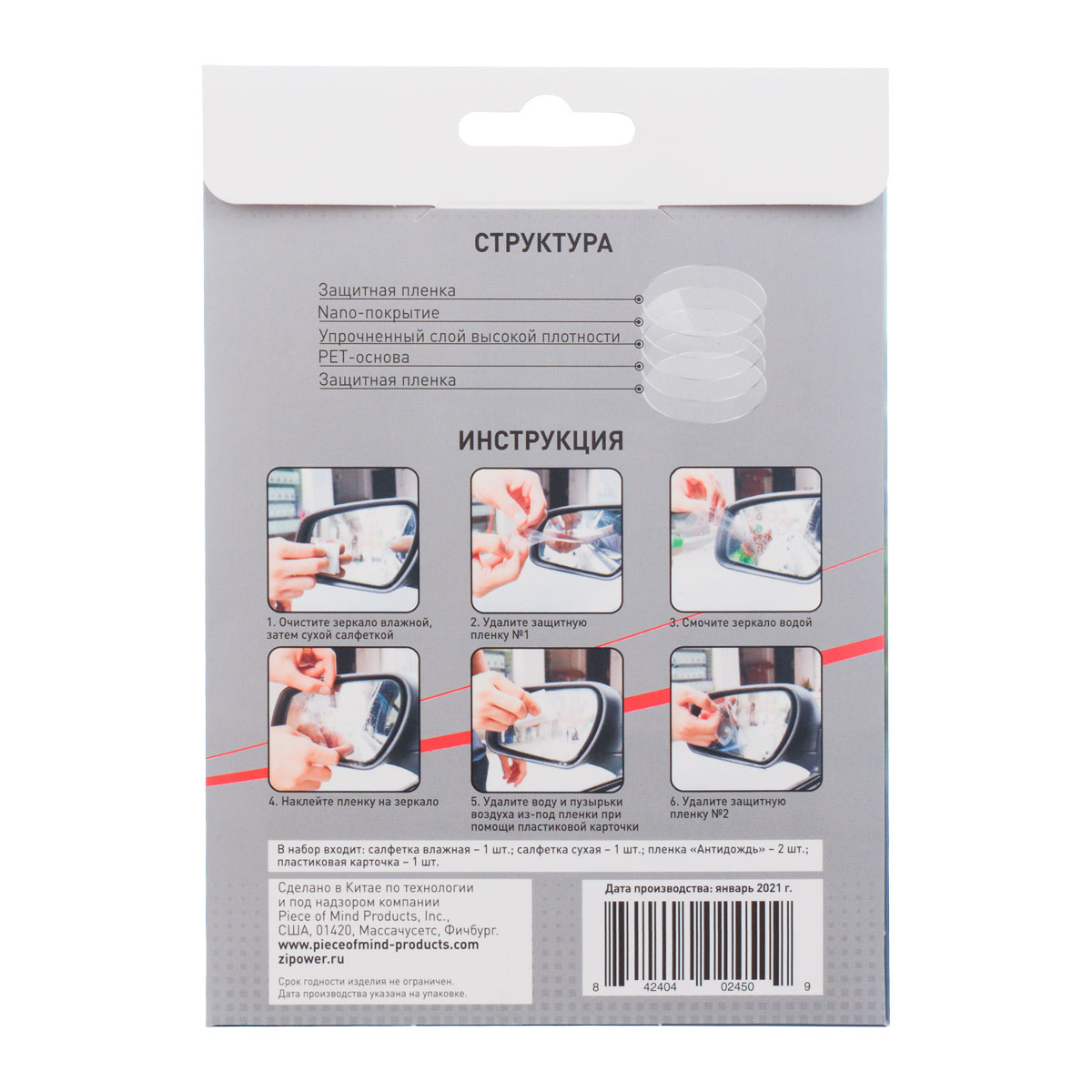 Пленка «Антидождь» повышает безопасность вождения автомобиля за счет улучшения обзора в боковых зеркалах заднего вида. Отталкивает влагу (дождь, снег). Предотвращает запотевание боковых зеркал. Препятствует загрязнению. Защищает от царапин. Пленка олеофобная, на ней не остается отпечатков пальцев и других следов органического загрязнения.
