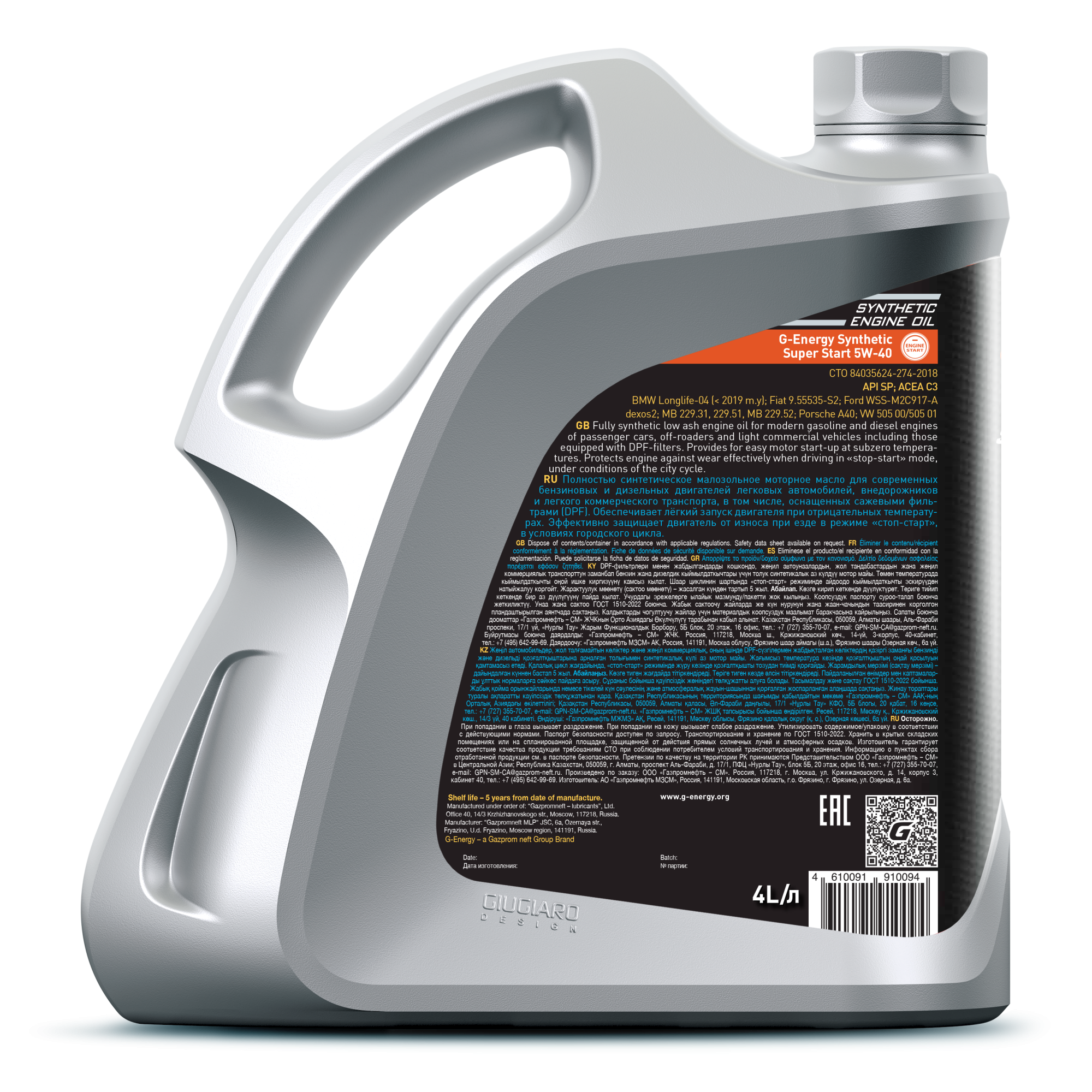 G-Energy Synthetic Super Start 5W-40 – синтетическое малозольное моторное масло на основе базовых компонентов G-Base с улучшенными низкотемпературными свойствами. Применимо для бензиновых и дизельных двигателей и совместимо с современными системами снижения токсичности выхлопных газов (в том числе c сажевыми фильтрами (DPF) и катализаторами (TWC)). Обеспечивает лёгкий запуск и надёжную защиту двигателя в широком диапазоне температур, в том числе при эксплуатации при низких температурах.